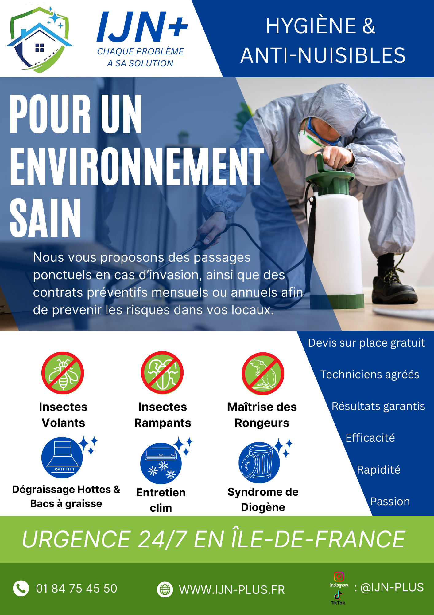 Nous sommes Lucas et Guillaume, fondateurs d'IJN+ spécialisés en dératisation, désinsectisation et désinfection, offrant des services de qualité pour un environnement sain et sécurisé.