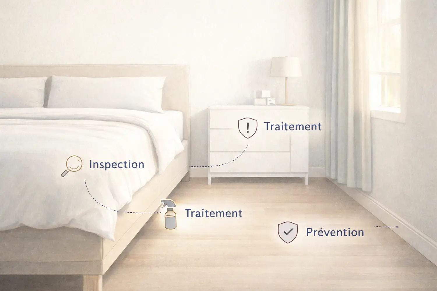 Le traitement dépend du niveau d’infestation, du type de logement, des contraintes (enfants, animaux, activité professionnelle) et des zones touchées.